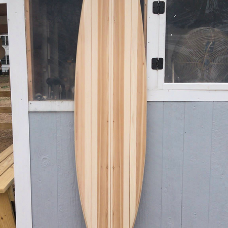 This Funboard/Mini-Mal piece is one of my original boards from the beginning. I was still perfecting my build style and while the inner skeleton looks somewhat bulky, it was made completely from Western Red Cedar and was extremely light. The outer skin including the checkerboard leash cup and nose embellishment was created using Western Red Cedar and Aspen.